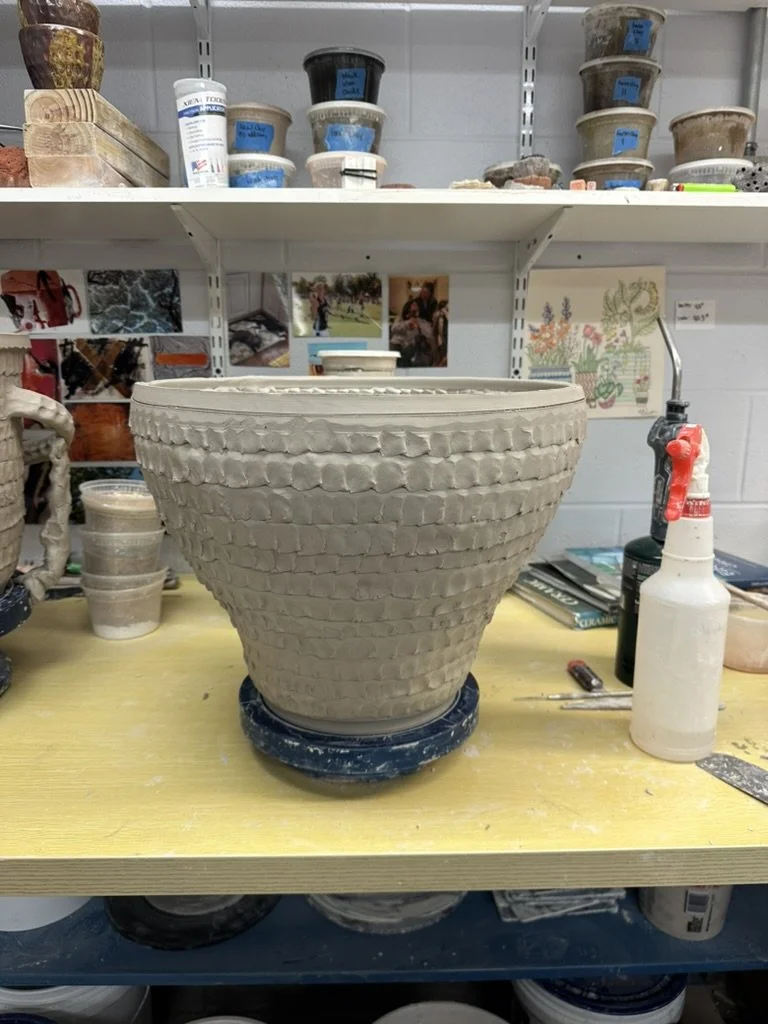 Hello! I currently only have one day off of work and this week I needed time for myself and to get some chores done around the house. I spent a lovely early fall day with Mia just being outside and enjoying each other's company. Tuesday I finally got around to making some work I’ve been thinking about. The first thing I started was my take on an ancient crockpot of sorts. I got the base done for the most part that day along with trimming those bigger serving bowls I threw. Wednesday I had work so didn’t make it in until Thursday’s class. We had a work period and I spent the first half mixing slips and some small clay bodies I wanted to test. I got the handles on the crockpot piece and mapped out where the cutouts were going to be. I didn’t have work after class so I started on a new form. I managed to get rather far on both projects which I am pleased with and excited to see where they go next week.